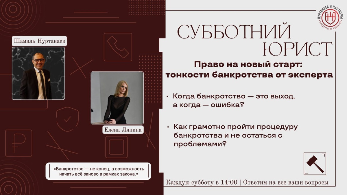 ⚡️⚡️⚡️⚡️Право на новый старт: тонкости банкротства от эксперта Об этом и о многих других вопросах мы поговорим завтра 7 июня на очередной трансляции "Субботнего Юриста" ⚖️ Эфир проведет юрист с более, чем 20 летней практикой – Шамиль Нуртанаев (нажав на имя вы можете узнать о юристе больше). Наш гость — Елена Ляпина, арбитражный управляющий с внушительным опытом с 2016 года. Начала карьеру с экономики, после, перешла в сферу банкротства. Пройдя путь от помощника до квалифицированного арбитражного управляющего, она вступила в СРО и накопила обширную практику. Сегодня Елена помогает клиентам избавиться от долгов и уверенно идёт к получению второго высшего — по юриспруденции. Тема эфира: «Основы Банкротства» 📝 Вот основные вопросы, которые мы обсудим в эфире: 1. Когда банкротство — это выход, а когда — ошибка? 2. Как грамотно пройти процедуру банкротства и не остаться с проблемами? Также, каждый может задать свой вопрос любым удобным для вас способом, перейдя по ссылке: https://cl