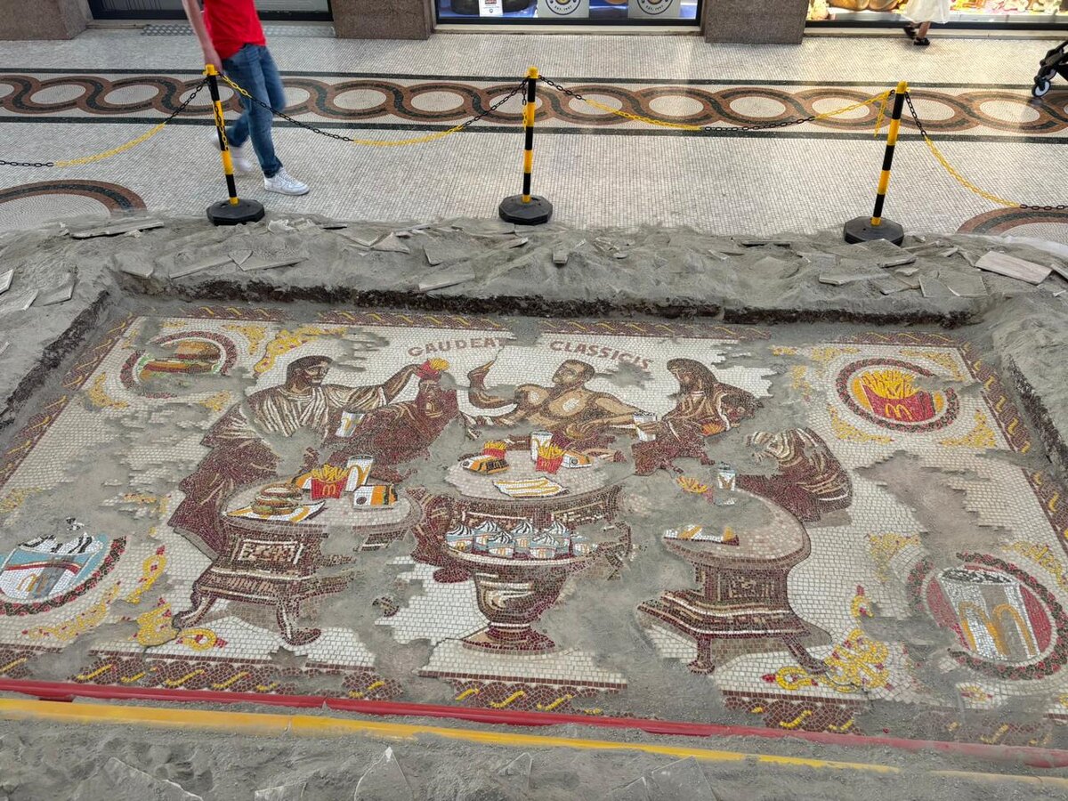 В Риме компания McDonald’s представила необычную рекламную кампанию: ее стилизовали под старинную мозаику и разместили в Галерее Альберто Сорди. Инсталляция является отсылкой к термополиям – античным римским заведениям, предлагавшим горячую пищу и напитки.