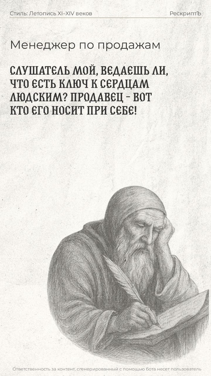 Сегодня — День Русского Языка. На просторах ТГ в канале https://t.me/elenapargina увидела интересный бот, превращающий наши современные слова в старорусские! На фото - "менеджер по продажам" 😉 Вот как можно назвать менеджера по продажам на языке разных эпох: Летопись XI–XIV веков: "Слушатель мой, ведаешь ли, что есть ключ к сердцам людским? Продавец – вот кто его носит при себе!" Высокий штиль XVIII века: "Служитель муз торговли и сделок, купец красноречия и обходительности!" Пушкинская поэзия: "Князь, нам надобно сыскать толкового приказчика для торговли" Язык меняется, но суть профессии — искать путь к человеку — остаётся. А все, кто занят в продажах, знают, как важно каждое сказанное или написанное слово ❤️ Поздравляю с праздником! Берегите слово. Говорите точно. Продавайте красиво. Поиграть с ботом: @rescript_old_bot #праздник, #день_русского_языка, #говорите_красиво, #пишите_красиво
