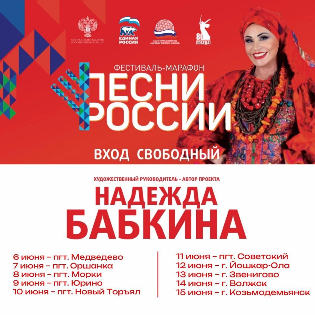 Народная актриса Надежда Бабкина пригласила жителей Марий Эл на Всероссийский фестиваль-марафон «Песни России». В нашей республике мероприятие будет проходить с 6 по 15 июня. В Йошкар-Оле народная артистка Надежда Бабкина и лучшие фольклорные коллективы России выступят на Патриаршей площади в 19:00, сообщили в мэрии столицы. Перед концертом пройдет флешмоб, поэтому жителей столицы приглашают прийти в народных костюмах или с элементами традиционной одежды. Кроме Йошкар-Олы фестиваль-марафон «Песни России» пройдет в Медведеве, Оршанке, Морках, Юрино, Новом Торъяле, а также в Советском, Звенигове, Волжске и Козьмодемьянске. Вход свободный. 📸 Скрин: мэрия Йошкар-Олы