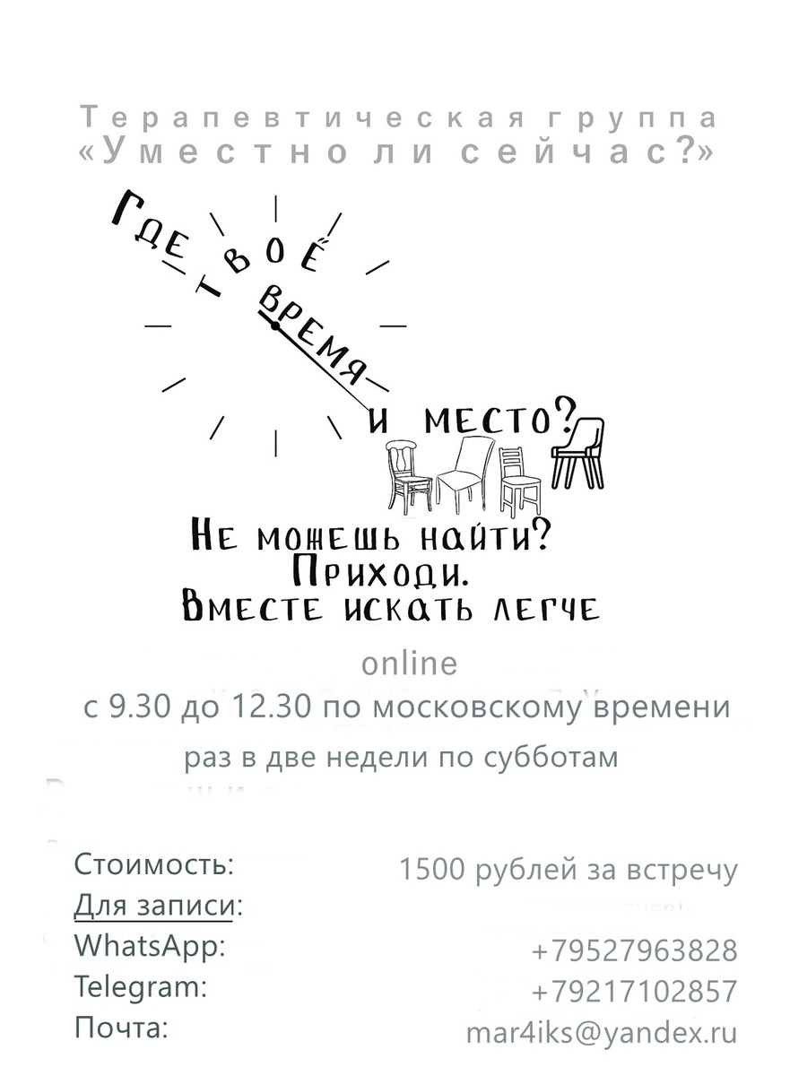 Примерно так у меня сейчас с группой, где я предлагаю присмотреться к тому, как выглядит именно ваше ощущение собственной неуместности и попробовать-таки найти для себя место, время, право хотеть, возможность быть.