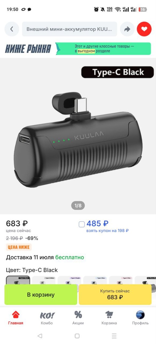 Внешний мини-аккумулятор KUULAA на 4500mAh для iPhone 16 15 14 13 Pro Max и Samsung/Xiaomi за 485 ₽ с купоном