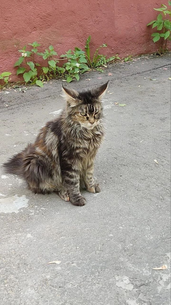 Во дворе в поисках еды скитается кошечка мейн кун. Предположительно беременная