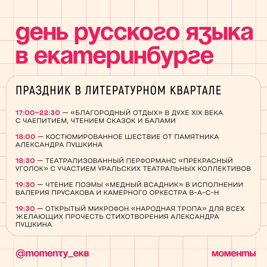 Сегодня вся страна отмечает день рождения великого поэта Александра Пушкина и День русского языка. Екатеринбург не остался в стороне — праздник пройдет в Литературном квартале. Собрали программу мероприятий, чтобы вы могли выбрать, как провести этот вечер. #Моменты_афиша Подписаться 🔸 Обсудить