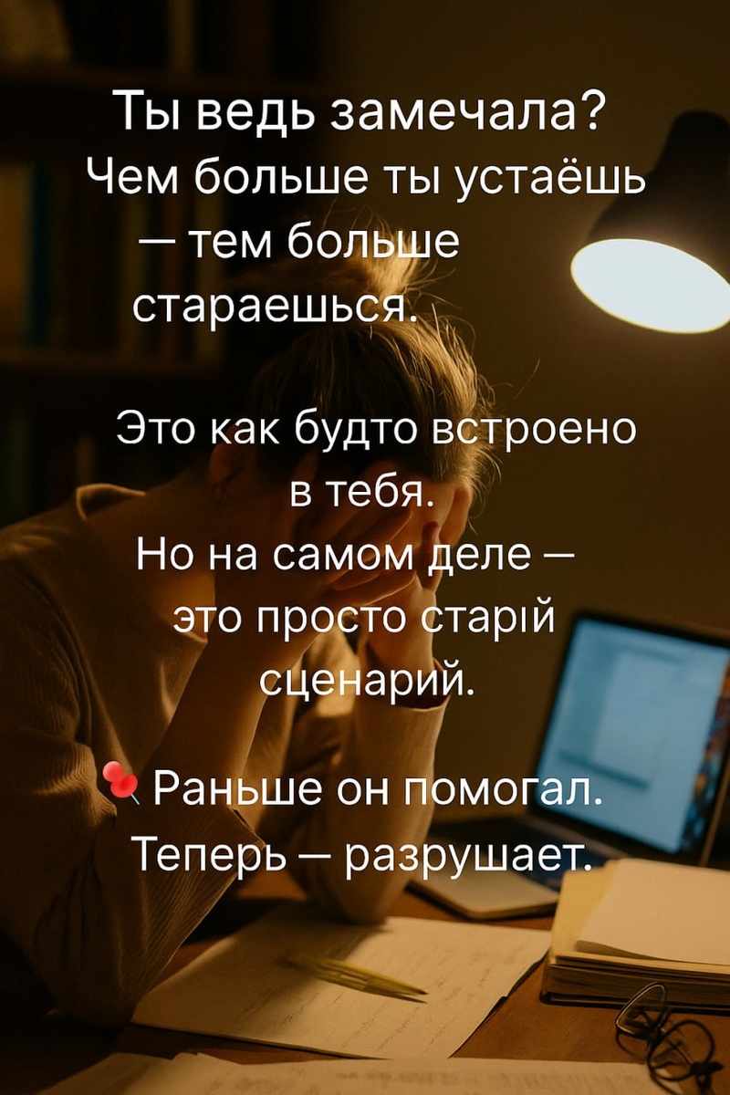🌾 Мини-техника «А можно по-другому?» Когда ловишь себя на том, что снова тащишь всё на себе” — остановись. Всего на 1 минуту Шаг 1. Заметь Спроси себя прямо сейчас: «Я правда хочу это делать… или я просто *не могу не делать*?» 🤍 Если почувствовала тяжесть — это не желание, это автомат. --- Шаг 2. Остановись на дыхании Сделай 3 медленных вдоха и выдоха. Прямо в моменте. Без изменений — просто дыши. Шаг 3. Переход в выбор Спроси себя: «Если бы я могла выбрать… как бы я сделала это по-другому?» Что бы я отложила? Что бы делала мягче? Что бы дала себе — вместо давления? 🌿 Иногда выбор — это минус одна задача Иногда — 10 минут тишины Иногда — просто "я потом подумаю, стоит ли вообще". И это уже выход из круга "не могу по-другому". --- 📌 Делай эту практику каждый раз, когда чувствуешь: “Я снова в режиме — выжить, успеть, заслужить.” ⠀ Ты можешь жить иначе. Мягко. В своём ритме. Без вины. Мастер позитивного состояния 🌿
