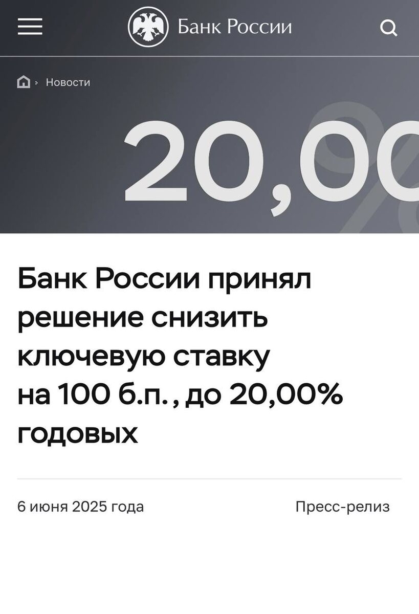 Банк России принял решение снизить ключевую ставку на 100 б.п., до 20,00% годовых
