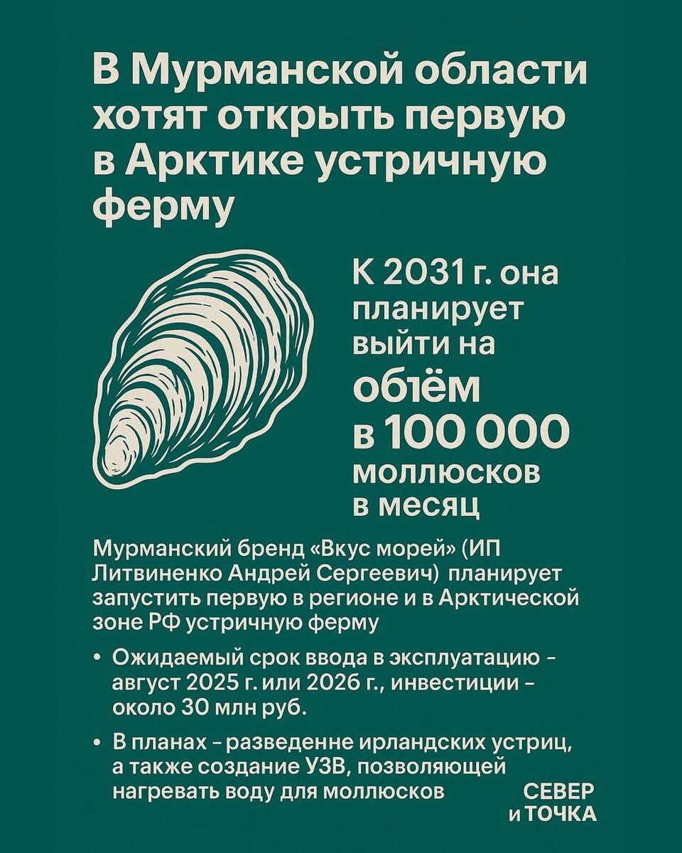 🦪 Устрицы в Арктике — не фантастика, а план на будущее! Мурманская область готовится к запуску первой в Арктике устричной фермы — и это не просто смелый проект, а настоящий гастрономический прорыв. 📍Проект принадлежит бренду «Вкус морей» (ИП Литвиненко Андрей Сергеевич). Уже в августе 2025 или 2026 года, в зависимости от сроков согласований, ферма может заработать на полную. 💰Инвестиции — порядка 30 млн рублей. 📦 А к 2031 году мощность планируется до 100 000 устриц в месяц. 🌊 Баренцево море — самое солёное и чистое на всём севере России. Если устрица не пришла сюда сама — её стоит привезти. В планах — разведение ирландских устриц, адаптированных к холодной воде. Также рассматривается создание УЗВ (установки замкнутого водоснабжения) — это даст гибкость в выборе места: от Кольского и Печенгского округов до Терского с выходом к Белому морю. 🚚 Доставлять морскую воду, работать у самого побережья, поставлять свежий продукт ресторанам и рынкам — всё это уже начало воплощаться. Сейч