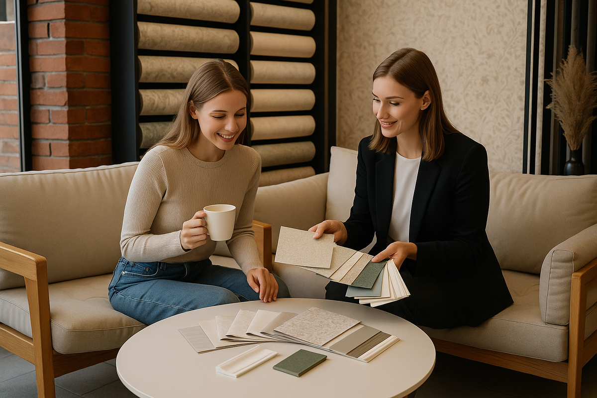 Вы не обязаны быть дизайнером, чтобы выбрать идеально — главное, с кем вы выбираете Представьте: вы в поисках отделочных материалов заходите в салон, где их более 250 000 вариантов. Обои всех оттенков и узоров, лепнина, краски, свет, профиль, ламинат. Вы вроде бы рады, что есть из чего выбрать — но через 10 минут в голове начинает шуметь. Где моё? Как понять? А вдруг ошибусь? Мы вас понимаем. И именно поэтому сделали всё, чтобы вы не утонули в выборе, а нашли своё — с удовольствием и уверенностью. Потому что он похож на ответственность. Кажется, что нужно «всё знать», иметь вкус, понимать сочетаемость, тренды и ещё сто нюансов. Кажется, что легко промахнуться — и потом каждый день смотреть на обои, которые не радуют. Кажется, что дизайнерский выбор — это для дизайнеров. Но давайте скажем честно: никто не обязан быть дизайнером, чтобы сделать красиво. Главное — знать, где искать помощь. Выбор пугает не потому, что вы не умеете — а потому, что слишком много вариантов и слишком мало ориен