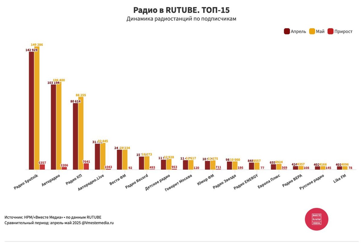 Динамика радиостанций по подписчикам (Апрель-май 2025) В мае отмечается более активная динамика прироста подписчиков у радиоканалов по сравнению с апрелем. ➡️ Радио Sputnik — абсолютный лидер по числу и приросту подписчиков ➡️ Авторадио, в категории >100К, набирает в мае 📈 + 3206 подписчиков ➡️ В категории >50К подписчиков одна радиостанция — Радио КП, которая лидирует в мае по приросту подписчиков - 📈 + 7 641 В мае тройка лидеров выглядит так: 1. Радио Sputnik — 142 929 2. Авторадио — 106 400 3. Радио КП — 88 255 Топ-5 по приросту подписчиков за апрель: 1. Радио КП 📈+ 7 641 2. Радио Sputnik 📈+ 6 357 3. Авторадио 📈+ 3 206 4. Авторадио.Live 📈+ 1 043 5. Детское Радио 📈+953 Топ-5 по числу подписчиков: 1. Радио Sputnik — 142 929📈+ 6 357 2. Авторадио — 106 400 📈+ 3 206 3. Радио КП — 88 255 📈+ 7 641 4. Авторадио.Live — 32 445 📈+ 1 043 5. Вести FM — 24 234📈+ 92 Смотреть топ-15 на графике Данные собраны и подготовлены исследовательской группой ЦРНМ «Новые русские медиа». Подписы