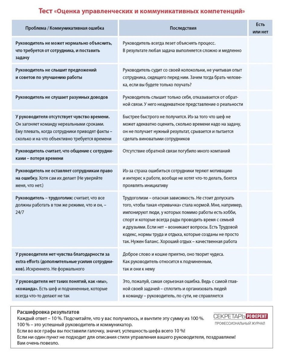 Предлагаем вам воспользоваться тестом, чтобы определить управленческие и коммуникативные навыки вашего руководителя. (Полезно зеркально оценить и свои, особенно если у вас в подчинении есть люди.)