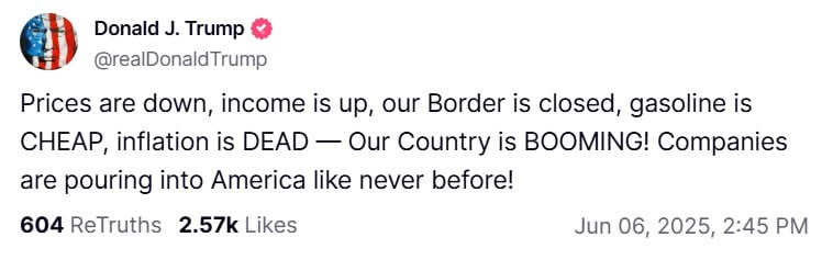 Trump takes to Truth Social to gloat about economy 'Prices down, income up, our Border (sic) is closed, gasoline is CHEAP, inflation is DEAD — Our Country is BOOMING! Companies are pouring into America like never before!' Will the BBB be a boost to these claims?