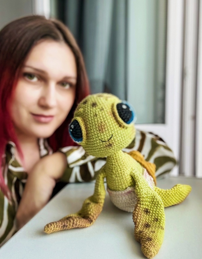 Привет-привет! В прошлый раз я обещала рассказать про игрушку, которую больше не возьмусь вязать. Этот пост посвящён вот этой черепашке. Связана она была по платному мастер-классу. К слову у автора их много. И каждая игрушка уникальная и необычная. Когда я увидела эту черепаху, сразу поняла, что хочу такую же. Дождалась выхода мастер-класса. Купила его. Купила все необходимые материалы. Вязала из турецкого полухлопка на проволочный каркас. Это был первый раз, когда я использовала проволоку в игрушке. И это, кстати, оказалось довольно трудно, потому что проволока постоянно выскакивает из деталей. А потом, когда всю её нужно соединить в один "скелет", то обвязывать становится ещё сложнее. Потом по сложности был панцирь. Состоит он из семи отдельных элементов, которые нужно соединить между собой. Из-за своей маленькости это было ощутимо трудно. Вся тонировка игрушки выполнена сухой пастелью. А глазки нарисованы краской по ткани. В инструкции пишут, что такую краску нужно закреплять горячи