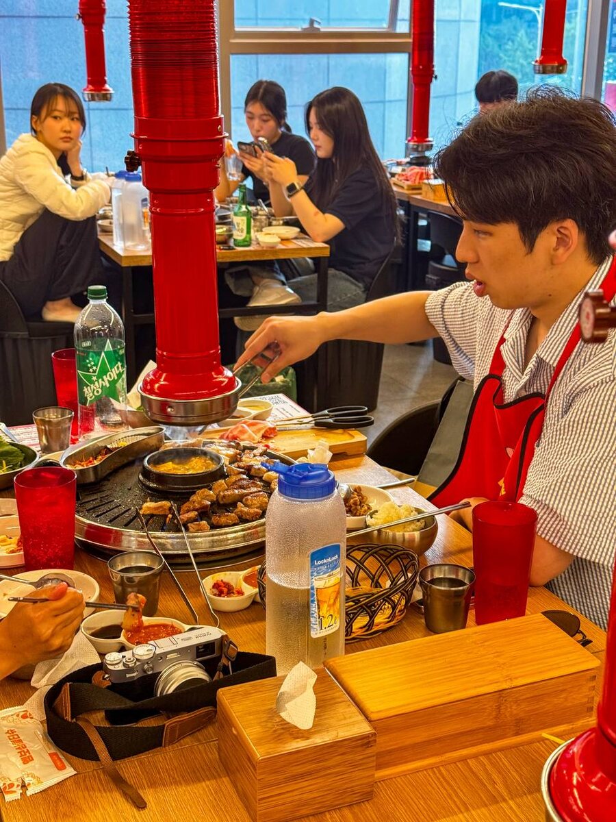 Я случайно вышел на каком-то этаже, зашёл в ресторан и… остался. За 23 000 вон — ешь, сколько хочешь. Так и называется - all you can eat. Причём мясо приносят холодное, а ты жаришь его сам, на специальной решётке. Где-то подводят газ, где-то даже ставят угли — зависит от места. И главное — это не только туристическая фишка. Там реально сидят корейцы, общаются, жарят, заливают это всё кимчи и душевным разговором. Правда, я советую надеть фартук, так как брызги от жарки мяса летят во все стороны.