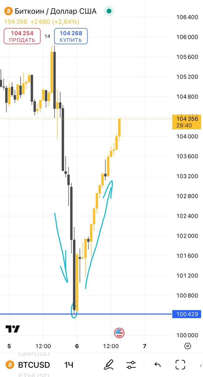 В ответ на пост 🪙Коснулся уровня поддержки 100400 и отскочил обратно. Красивое, энергичное движение
