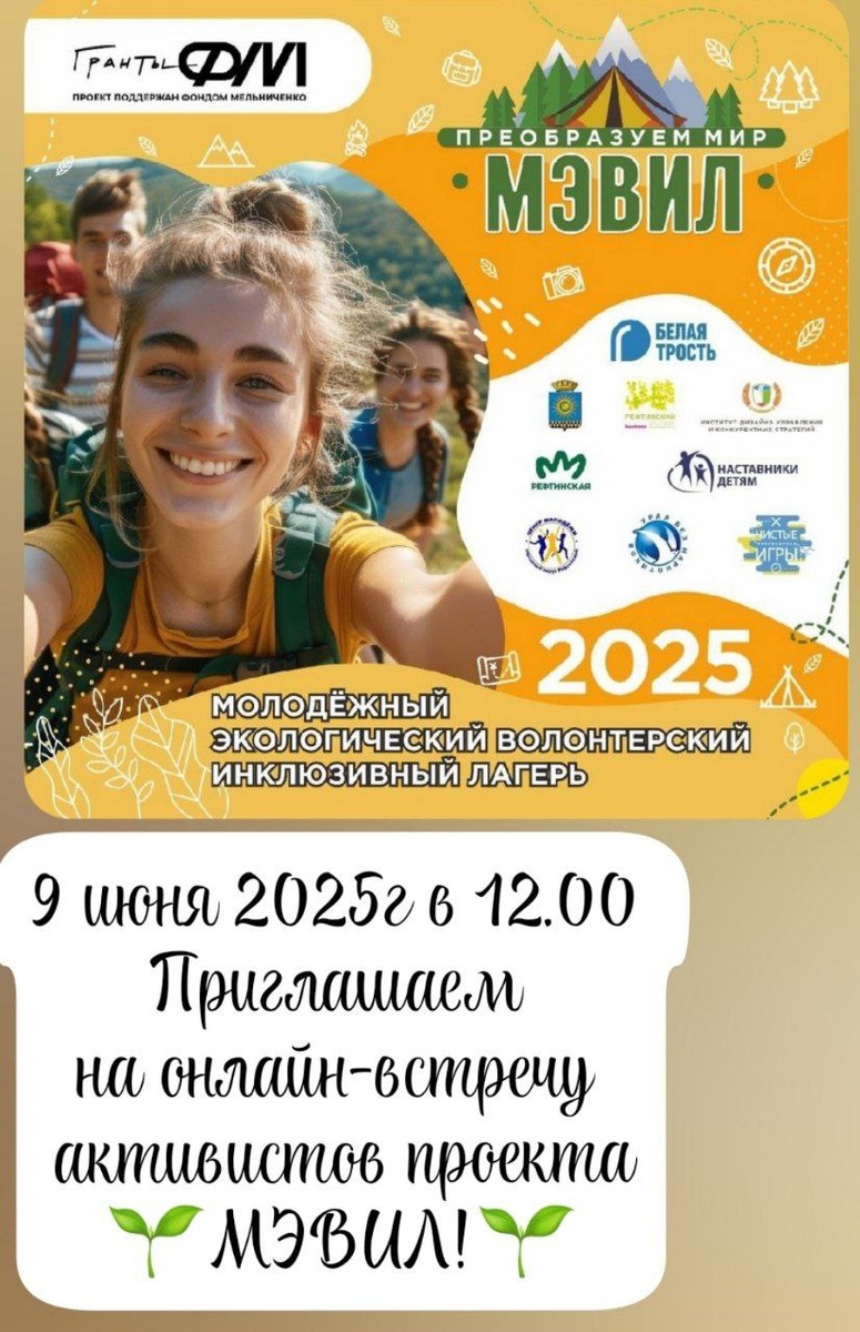 Приглашаем на онлайн-встречу активистов проекта МЭВИЛ! 🌱 Друзья, у нас важные и интересные новости! АНО БЕЛАЯ ТРОСТЬ приглашает вас на онлайн-встречу, где вы сможете: ✅ Узнать больше о проекте *МЭВИЛ (Молодёжный Экологический Волонтёрский Инклюзивный Лагерь-2025)* ✅ Познакомиться с командой и другими участниками ✅ Обсудить планы и возможности для вашего участия в роли волонтёров-организаторов Это отличный шанс получить практический опыт в подготовке масштабного и значимого события! 📅 Дата: 9 июня (понедельник) ⏰ Время: 12:00 📍 Подключиться можно по ссылке: 👉 Яндекс Телемост https://telemost.yandex.ru/j/18342428103186 Приходите, будем рады видеть каждого! Вместе сделаем МЭВИЛ-2025 ярким и незабываемым! #Рефтинский