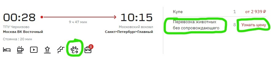 1. Заходите на официальный сайт РЖД www.rzd.ru/. (Не пользуйтесь всякими Тутуру и прочими посредниками). Ищете нужную дату и просматриваете все вероятные маршруты. Вам нужен тот маршрут, среди иконок услуг которого вы увидите лапку. Значит в этом поезде перевозят животных без сопровождения. 2. Справа вы увидите надписи"Перевозка животных бех сопровождающего" и "Узнать цену". Вы можете просто узнать стоимость услуги, если нажмете на вторую надпись. Первая надпись пере