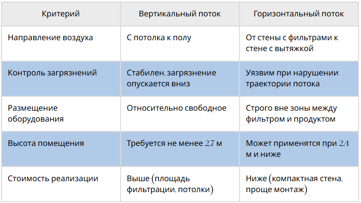 Но когда помещение низкое, узкое, либо когда оборудование и продукт можно локализовать у одной стены, горизонтальный однонаправленный поток становится оптимальным решением. Проектировщикам важно понимать: он работает, но только при грамотной компоновке. В противном случае поток превращается из защитного в источник перекрёстного загрязнения. В этой схеме: * воздух подаётся через стену, оборудованную НЕРА-фильтрами, * движется параллельно полу от фильтров к противоположной стене, * удаляется через воздухозаборные решётки, * частично возвращается в рециркуляцию. Поток представляет собой горизонтальный «воздушный поршень», выталкивающий загрязнения от фильтров к вытяжке. 3. Ключевая проблема: перекрёстный поток Одна из самых частых ошибок — размещение оператора или оборудования между НЕРА-фильтрами и продуктом. Это превращает поток в переносчик частиц от человека на