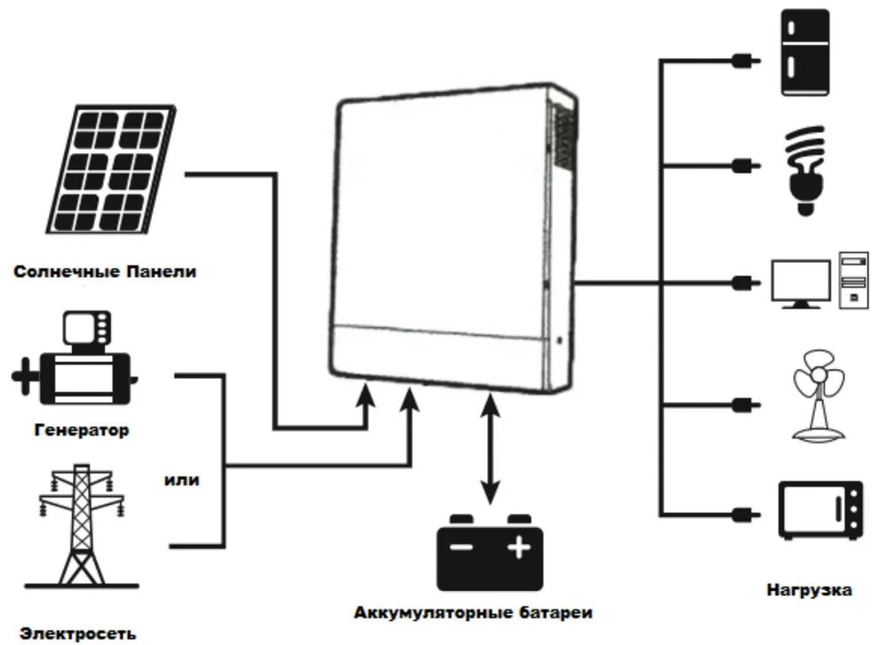 • Настройте приоритеты работы (например, сначала использовать солнечную энергию, затем аккумуляторы, а потом сеть) через меню инвертора.