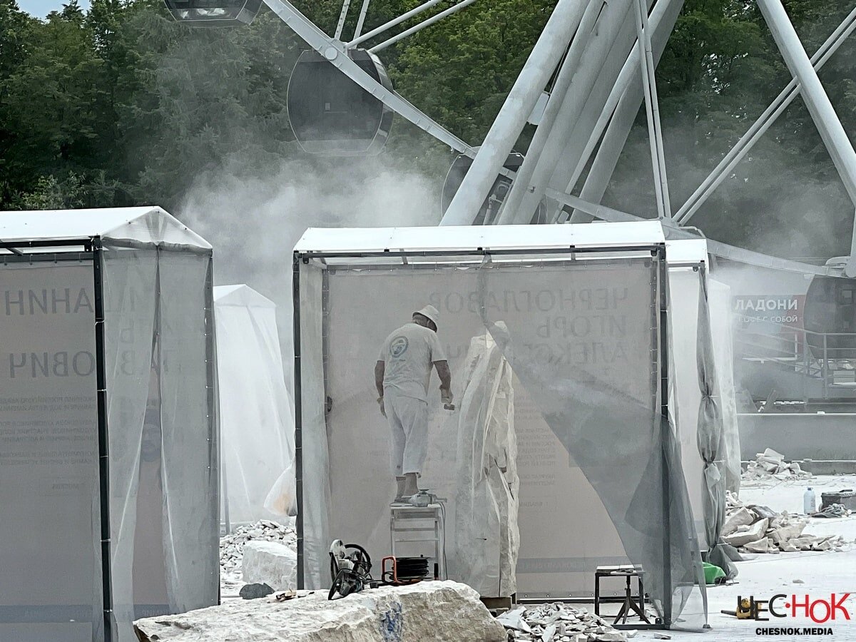 Изготовление скульптур идет прямо в парке рядом с колесом обозрения. Силуэты будущих шедевров уже вырисовываются, однако, как водится, красота требует жертв. Пыль от распила белого камня разлетается по всей площади около Звездного дома, и если работники находятся в респираторах, то посетителям парка приходится дышать этим «дымом Отечества». Насладиться процессом можно только издалека.