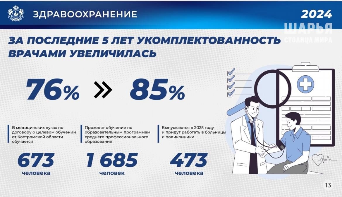 Недостаток кадров в медучреждениях пытаются ликвидировать Костромская область вынужденно конкурирует со столичным регионом, другими, более крупными, областными центрами и городами, которые могут предложить врачам и медсестрам более высокий уровень зарплат. Чтобы обучить медицинского работника требуется гораздо больше времени, чем специалиста в любой другой сфере. В регионе несколько лет принимаются управленческие решения, которые позволяют снижать остроту проблемы. За последние 5 лет укомплектованность врачами увеличилась с 76 до 85%. Этот показатель находится в зоне особого внимания областной администрации. Сейчас в медузах по целевым договорам от Костромской области обучается 673 студента, 1685 человек проходят обучение по образовательным программам СПО. 473 медицинских специалиста выпускаются в 2025 году и придут работать в больницы и поликлиники региона. #ОтчетГубернатораКО_2024 Шарья – столица мира Крупнейшее городское СМИ Источник