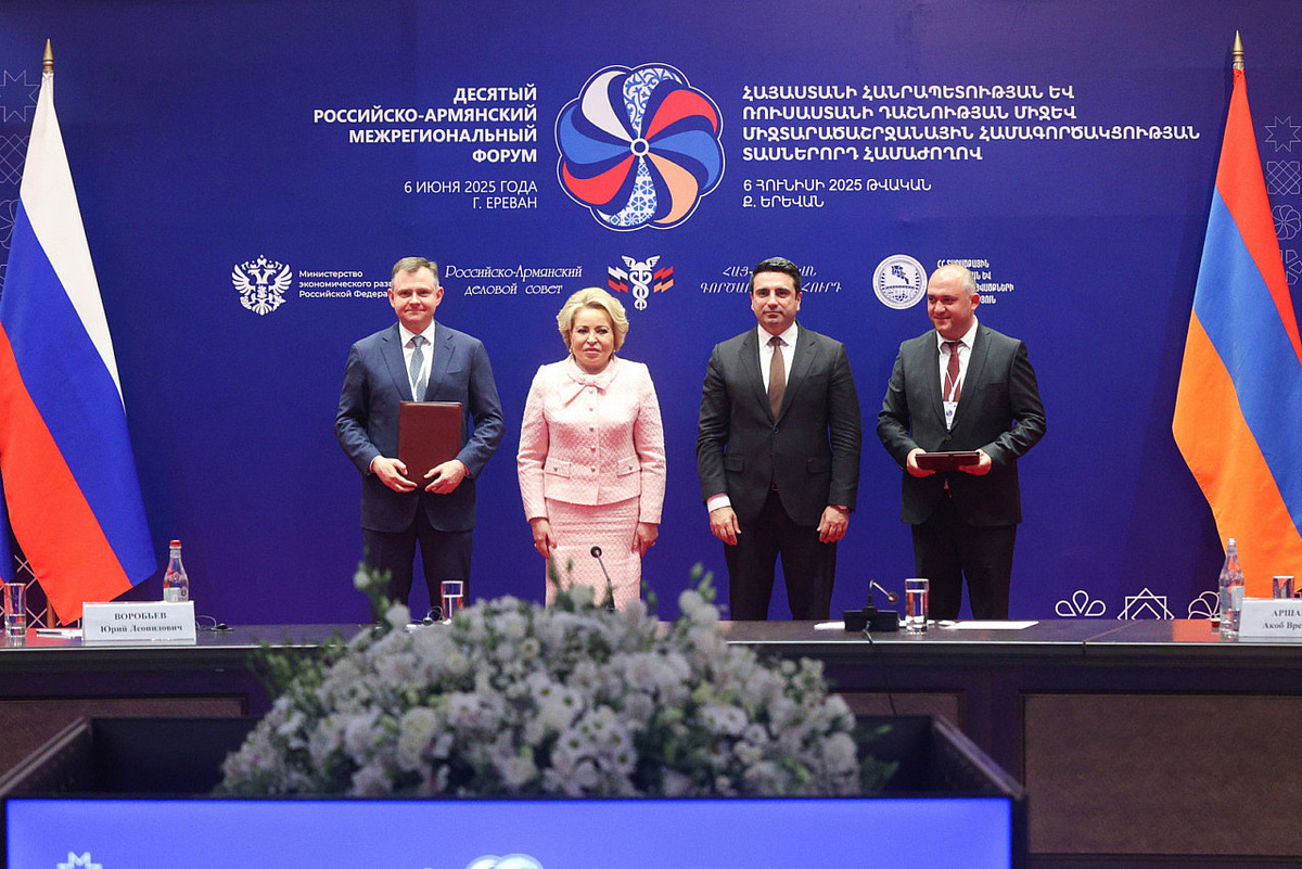Новое соглашение с Араратской областью о торгово-экономическом, научно-техническом, культурно-гуманитарном и социальном сотрудничестве Ростовская область заключила на X Российско-Армянском межрегиональном форуме. Врио губернатора Ростовской области Юрий Слюсарь принял участие в пленарном заседании форума. Обмен подписанным соглашением между делегациями правительства Ростовской области и аппарата марзпета Арарата Республики Армении состоялся после пленарного заседания. «Мы взаимодействуем с Арменией на межрегиональном и на межмуниципальном уровнях. Действует пять договоров о побратимских связях между муниципалитетами Ростовской области и Республики Армении. Рассчитываю, что подписанное сегодня соглашение о сотрудничестве с Араратской областью еще больше укрепит нашу дружбу», - сказал Юрий Слюсарь. Кроме того, на форуме прошли тематические круглые столы, посвященные вопросам формирования благоприятного инвестиционного климата регионов России и Армении, перспективам развития российско-арм