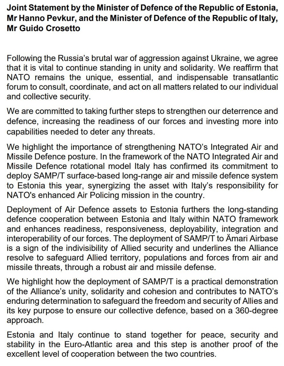 🟡 Кроме того, совместное использование инфраструктуры, обмен тактическим опытом и интеграция боевых элементов различных стран-членов НАТО рассматриваются как элементы углубления двустороннего оборонного сотрудничества между Эстонией и Италией. В заявлении подчёркивается, что размещение итальянской системы ПВО способствует укреплению способности к реагированию, гибкости, оперативной интеграции и повышению уровня общей оборонной устойчивости региона.
