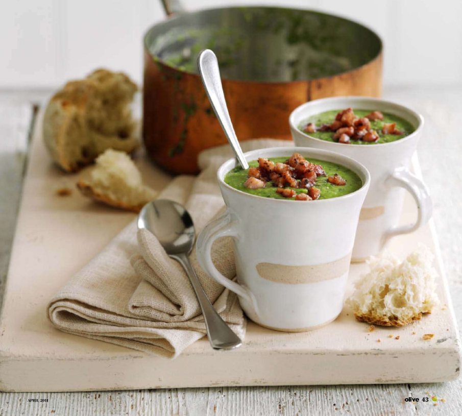 Время приготовления — 20 минут. 2 порции. Уровень сложности — лёгкий. Ингредиенты: - 70 граммов панчетты - 1 среднего размера очищенная и нарезанная картофелина - 500 миллилитров куриного бульона - 250 граммов замороженного зелёного гороха - нарезанная половина небольшого пучка мяты - багет для сервировки Обжарьте панчетту на сковороде с антипригарным покрытием (масло добавлять не надо, так как она будет готовиться на собственном жиру). Когда она подрумянится и станет хрустящей, отложите немного для украшения супа. Добавьте в куриный бульон картофель и оставшуюся панчетту. Нагрейте бульон и на медленном огне кипятите до полного размягчения картофеля. Положите в бульон горох и кипятите на медленном огне ещё 3 минуты, затем добавьте мяту. Поместите бульон с ингредиентами в миксер и измельчите до получения однородной массы. Перед подачей положите сверху в суп отложенную ранее панчетту. Подавайте с багетом. В одной порции: 251 килокалория, 16.1 грамма белка, 21.8 грамма углеводов, 11.6 гра