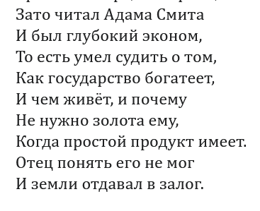 С другой стороны денежные вопросы героев практически никак не отражены на страницах произведений. Мы совсем не знаем насколько были богаты или бедны: Евгений Онегин, Ленский, семья Лариных, муж Татьяны Лариной и так далее.