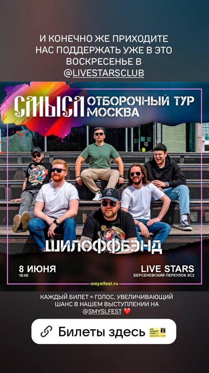 Сегодня будет подорожание билетов❗️на концерт отборочного тура фестиваля СМЫСЛ 2025 😎 Столы уже разобрали 🫣 Успей купить по старой цене и с промокодом ШИЛОФФБЭНД (10% скидка): БИЛЕТЫ ЗДЕСЬ! И не забывайте: вы еще можете успеть принять участие в розыгрыше бесплатных билетов, а на концерте мы разыграем футболку! Приходи нас поддержать! 🤩