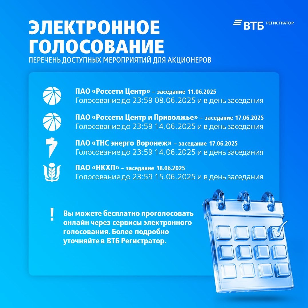👍 Голосуйте бесплатно и онлайн через сервис электронного голосования ВТБ Регистратор - вне зависимости от места учета акций! Перейти к голосованию Наша техподдержка ответит на ваши вопросы: edo@vtbreg.ru +7 (495) 640-11-12 #ВТБРегистратор #ГЗОСА2025 #КВОРУМ #MRKC #MRKP #VRSB #NKHP