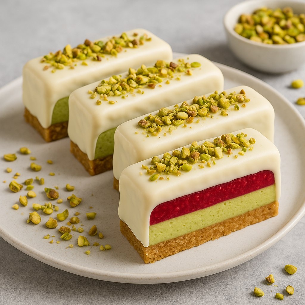 на 100 граммов 1. Создание основы. Начнем с приготовления песочной основы. В блендере измельчите печенье до состояния мелкой крошки, затем добавьте мягкое сливочное масло. Тщательно перемешайте до однородной массы и равномерно распределите по формам, утрамбовывая. Отправьте в холодильник на 10-15 минут, чтобы основа застыла. 2. Приготовление сливочной начинки. Залейте желатин водой и дайте ему набухнуть. В отдельной миске соедините творожный сыр с фисташковой пастой и сгущенным молоком, тщательно перемешивая до получения однородной массы. Взбейте сливки до мягких пиков и растопите желатин в микроволновке (примерно 5-7 секунд). Влейте желатин в сырную массу, постоянно помешивая. После этого аккуратно добавьте взбитые сливки и снова перемешайте до однородности. 3. Формируем батончики. Переложите получившуюся начинку в кондитерский мешок и отсадите в подготовленные формы. Уберите в морозильник на 3-5 часов, чтобы начинка полностью застыла. 4. Готовим малиновое конфи. Пока наши батончики з