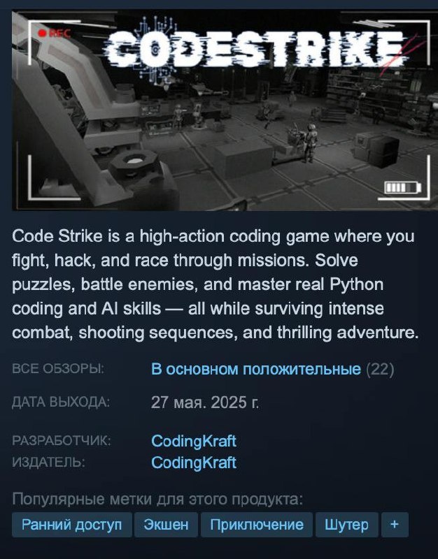 🎮 Учимся Python прямо в бою — в Steam бесплатно раздают CodeStrike! Это не просто игра — это шпионский экшен, где ты решаешь всё кодом. В CodeStrike ты — элитный агент, действующий в мире, захваченном ИИ и алчными корпорациями. 💻 Что тебя ждёт: • Пишешь Python-код • Ломаешь системы, обходишь ловушки, взрываешь и взламываешь • Программируешь поведение героя в реальном времени • Участвуешь в гонках, сражениях и выживании — только с помощью кода Это как если бы *Metal Gear* встретился с *LeetCode* — но весело. 🐍 Прокачай Python, даже не замечая, как учишься. ⚡ Вкатиться можно здесь: https://store.steampowered.com/app/3444170/CodeStrike__Python_Practice_Adventure_Game/ @pythonl