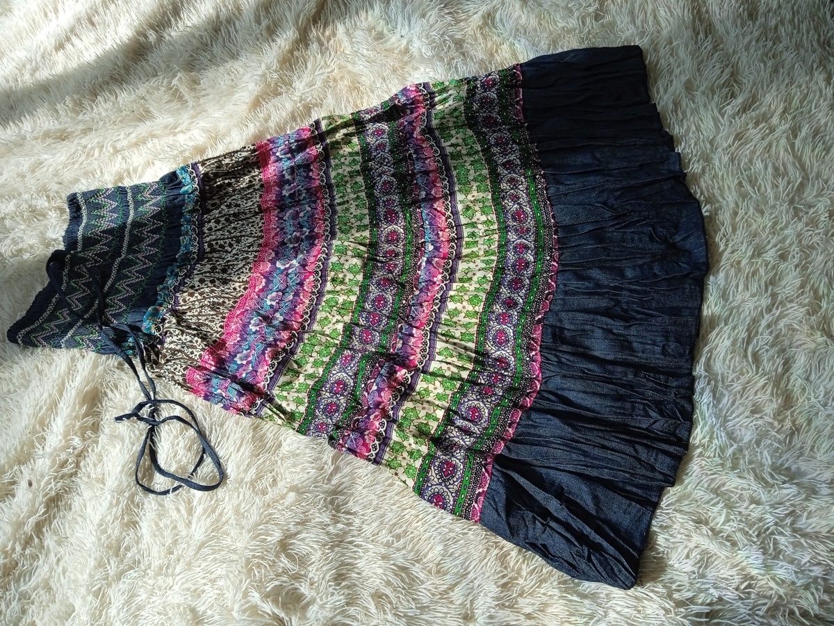 ...Сегодня у меня внезапно образовался выходной, и я поехала шариться по магазинам, ОДНА! без детей, чтобы всласть намериться шмоточек. Зашла в МегаХенд, но скидок сегодня не было, поэтому ничего не выбрала. Зашла в Планету одежды, купила чёрные тапки вместо своих уставших, с порванной подошвой. А потом, уже возвращаясь домой, зарулила в крохотный шмоточный отдел в цоколе и там цепким взором углядела на вешалке ЕЁ. Вот эту юбку. По совершенно смешной цене – всего 500 рублей! Она сразу привлекла моё внимание своей необычностью и яркостью. Какая-то этническая, с красивым сочетанием цвета. Не ручная вышивка конечно, но у китайских мастериц получилось вполне похоже. … Смущала длина. Практически в пол. А в качестве сарафана - ну совсем никак. И сочетать мне её не с чем, нужна светлая куртка... С сожалением повесила обратно на вешалку, пошла, походила, чувствую - ну блин, такая красивая, может всё-таки подойдёт к чему-нибудь... - и вернулась в магазин. Пошла померить снова, по второму р