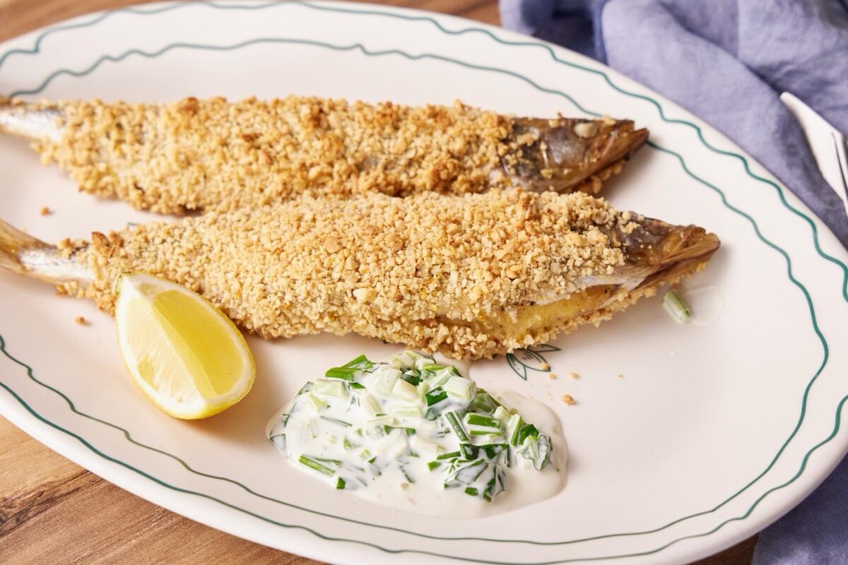Обмакните рыбу во взбитые яйца, затем обваляйте в арахисовой панировке, покрывая также голову и кончик хвостика. Повторите с остальными рыбками.