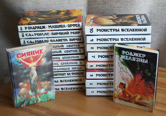 Книжная серия «Монстры Вселенной». Тома I–V Книжная серия «Монстры Вселенной». Тома VI–XV Книжная серия «Монстры Вселенной». Тома XVI–XXVIII. «Монстры Вселенной» — одна из первых фантастических серий. Всего в ней вышло 28 книг. Издателями книги, видимо, воспринимались, как альманахи, поскольку многие романы в ней публиковались с продолжением. Самым представленным автором в серии стал Роджер Желязны. На обложках серии использовались иллюстрации художника Бориса Вальехо (Валеджио). Список книг: Том I. Роджер Желязны. Девять принцев Амбера Ружья Авалона Знак Единорога Рука Оберона Двор Хаоса. Том II. Роджер Желязны. Знамения судьбы Кровь Амбера Знак Хаоса Рыцарь Отражений. Том III. Роджер Желязны. Бог света Этот бессмертный Джек-из-Тени Мастер снов Долина проклятий Дева и чудовище Сергей Битюцкий. Когда расцветают бомбы. Том IV. Роджер Желязны. Принц Хаоса Путеводитель по Замку Амбера. Том V. Роджер Желязны. Остров мертвых Созданья света, созданья тьмы… Подмененный Умереть в Италбаре Знак