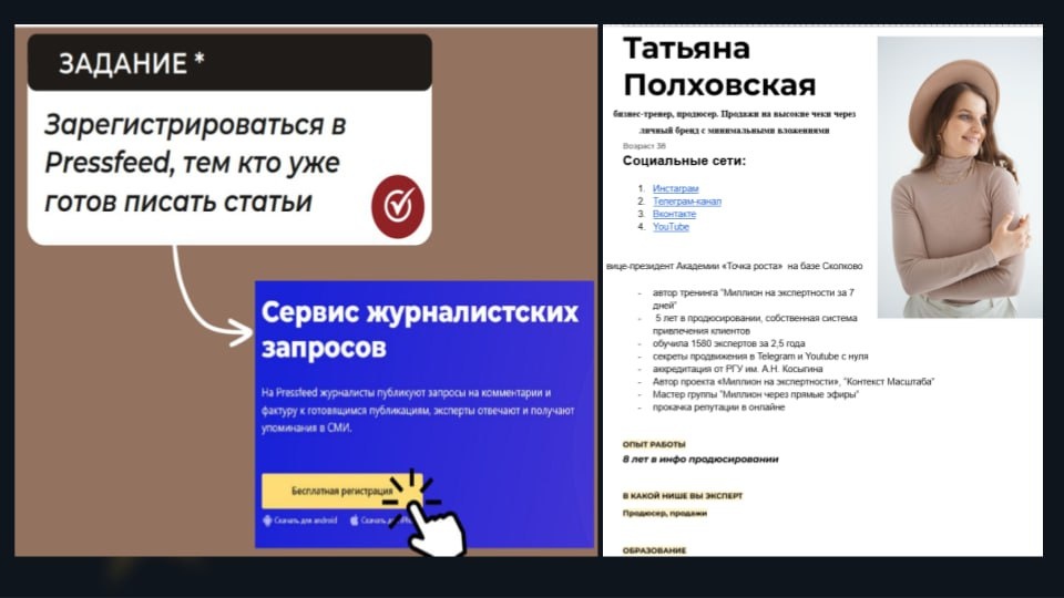 Доверие через формат медийности. Как приятно получать награду , особенно, когда все случилось само собой С нами уже прошли челлендж Миллион через медийность более 150 человек и я всегда рекомендую Сервис Pressfeed а тут еще и подарки мне дали 😍 В честь этого Вам тоже даю 🎁 подарок Шаблон "Досье медийного эксперта" (аналог пресс-кита) Хочу шаблон ( нажмите ссылку и отправьте мне сообщение, и я пришлю шаблон) ❤️❇️ а это сам сервис, где вы сможете получать запросы на ваши статьи Pressfeed зарегистрироваться по ссылке (нажать сюда)