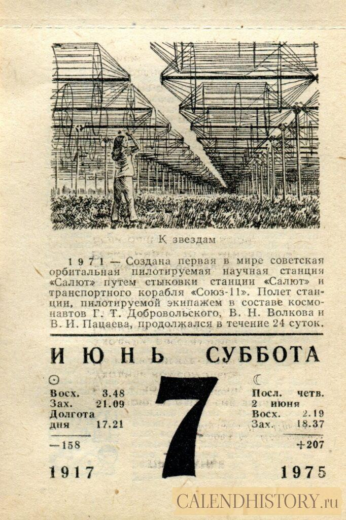 Итак, сегодня 7-го июня и у нас на календаре 1975-й год. Перед нами листок советского календаря для женщин. На календаре у нас суббота - 7 июня 1975-го года. К звездам 1971 — Создана первая в мире советская орбитальная пилотируемая научная станция «Салют» путем стыковки станции «Салют» и транспортного корабля «Союз-11». Полет станции, пилотируемой экипажем в составе космонавтов Г. Т. Добровольского, В. Н. Волкова и В. И. Пацаева, продолжался в течение 24 суток. *** Оборотную сторону листка этого календаря можно посмотреть у нас по ссылке на сайте. Другие листки советских календарей смотрите у нас на сайте - CALENDHISTORY.ru ПОСМОТРИТЕ ЕЩЁ ЛИСТКИ ОТРЫВНЫХ КАЛЕНДАРЕЙ: