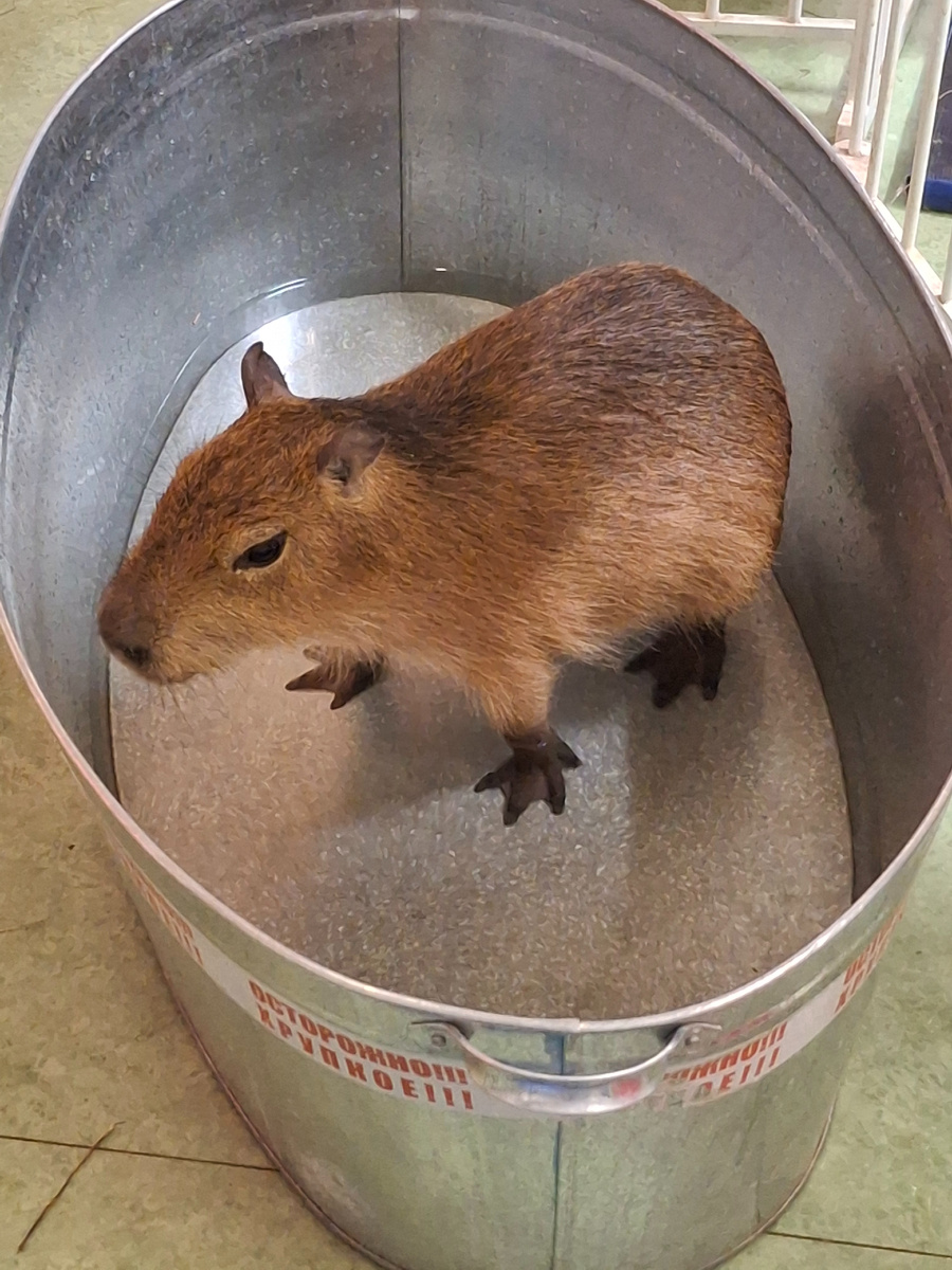 Капибары, капибары.... Мы очень хотели пообщаться с этими удивительными животными. Ранее мы уже приезжали в Бар Капибар, но смогли подружиться только с ближайшими родственниками капибар - с нутриями.Сейчас в Бар Капибар есть две капибары: Капислав и Дуняша. Они оба уже освоились на новом месте жительства и с удовольствием общаются со своими гостями. Нам очень повезло, во время нашего общения с капибарами у них было время купания. Киперы принесли ванну и пошли наливать воду в ведро. Дуняша не дожидаясь воды, запрыгнула в пустое корыто и всем своим видом показывала как ей нетерпится искупаться.Дети были в восторге от купания купибары. Младшая дочь вообще не отходила от Дуняши, постоянно поливала водичкой на спинку. Дуняша при этом довольно шевелила ушками и время от времени подныривала под воду или ложилась на бочок. За отведенное время для общения с капибарами дочери успели покормить капибар листьями салата, наобниматься и даже искупать этих удивительных грызунов. Капибары очень добр