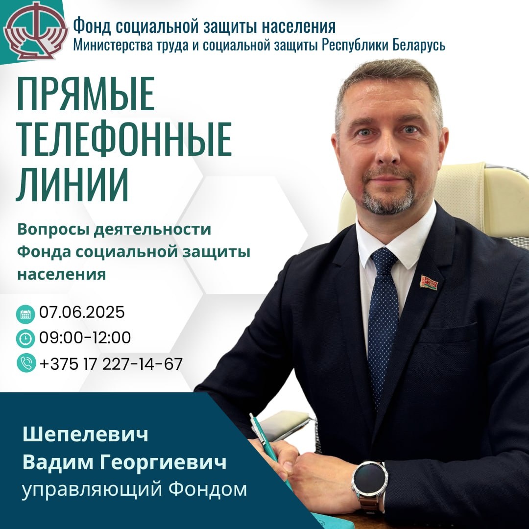 🔥Прямая телефонная линия по вопросам деятельности Фонда социальной защиты населения Завтра, 7 июня, на прямой телефонной линии - управляющий Фондом ШЕПЕЛЕВИЧ Вадим Георгиевич. ⏰9.00 до 12.00 ☎️ +375 17 227-14-67