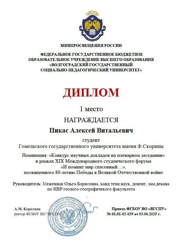 🥇Студент геолого-географического факультета Алексей Пикас занял 1 место в номинации "Конкурс научных докладов на пленарном заседании" в рамках XIX Международного студенческого форума «И ПОМНИТ МИР СПАСЕННЫЙ…», посвященного 80-летию Победы в Великой Отечественной войне. Поздравляем Алексея и его руководителя, заместителя декана по идеологической и воспитатеной работе геолого-географического факультета Ольгу Меженную👏👏👏