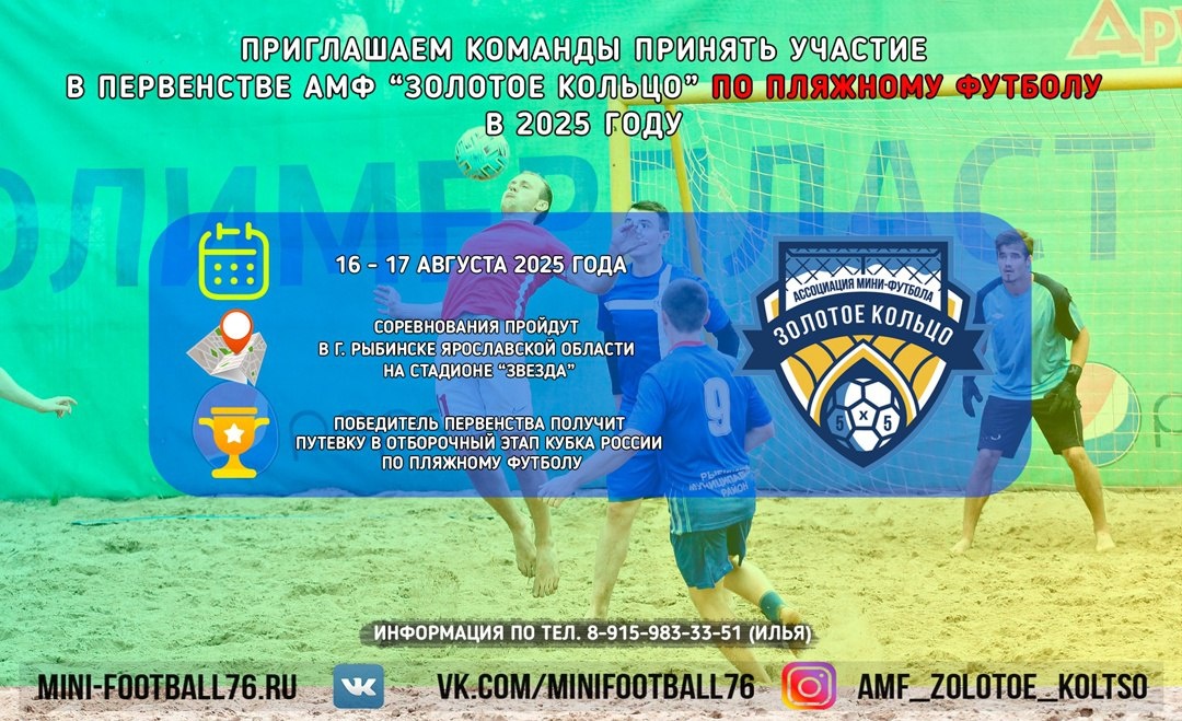 Ассоциация мини - футбола приглашает команды принять участие в Первенстве АМФ "Золотое кольцо" по ПЛЯЖНОМУ ФУТБОЛУ, которое пройдет 16-17 августа в Рыбинске.