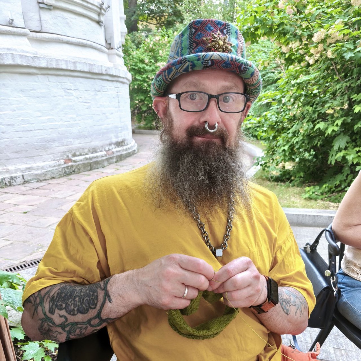 Пока я тщательно готовлю к публикации историю, которую я поведал собравшимся на посиделках в этот четверг, предлагаю полюбоваться моим ярким летним образом, ведь вязание в моих руках настолько мелкое, что его почти не видно.