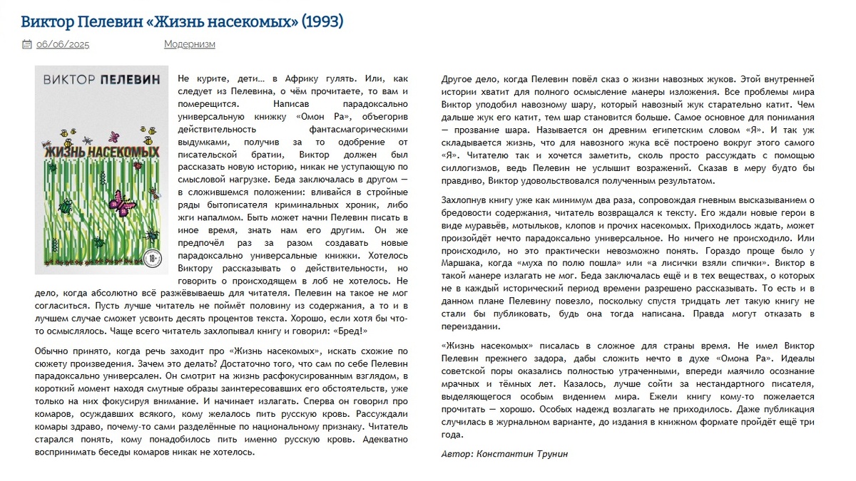 Виктор Пелевин "Жизнь насекомых" (1993) | Критика