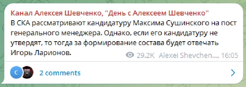 Журналист Алексей Шевченко сообщил, что СКА рассматривает на должность генерального менеджера Максима Сушинского. Если Сушинского не утвердят, то тогда за формирование состава будет отвечать новый главный тренер Игорь Ларионов. КТО ТАКОЙ СУШИНСКИЙ Единственной административной должностью в резюме Сушинского является пост президента омского «Авангарда», который он занимал в 2018-2020 годах. Сушинский получил пост благодаря тому, что на рубеже девяностых и нулевых годов провел лучшие годы карьеры в «Авангарде». Тогдашний председатель Совета директоров «Авангарда» Александр Крылов после увольнения Сушинского заявил, что тот не справился со своими обязанностями, хотя ему в клубе создали все условия для работы. Крылов отметил, что менеджмент «Авангарда» понимал, что Сушинский никогда не был CEO, поэтому с него были сняты административные вопросы. Сушинский не занимался строительством новой арены и хоккейной академии и не отвечал за бюджетирование и маркетинг. Сушинский в «Авангарде», по сло