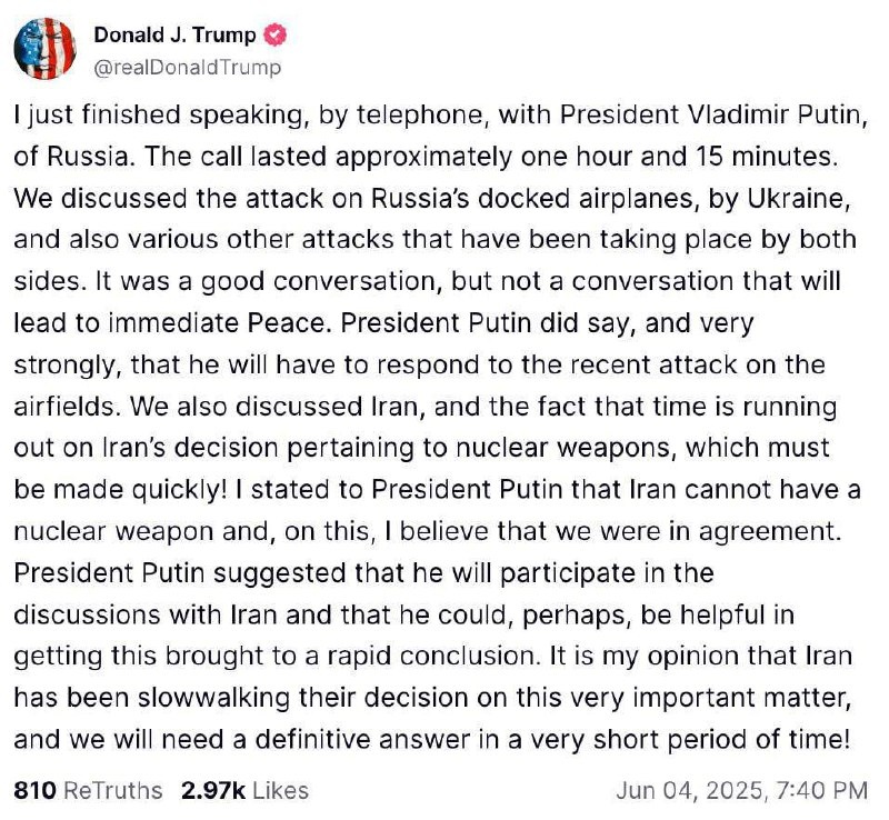 На фоне терактов киевского режима в Курской и Брянской областях состоялся телефонный разговор Владимира Путина и Дональда Трампа. После этого Трамп опубликовал в соцсети Truth Social следующий пост: "Президент Путин с большой решимостью заявил, что будет вынужден отреагировать на недавнюю атаку на аэродромы. Это был хороший разговор, но не тот, который приведёт к немедленному заключению мира". Фактически это означает, что Дональд Трамп понимает мотивы российского удара — возмездия за украинские террористические акты. Понимает — и вынужден с ним согласиться. Также он фактически соглашается с тем, что заключение мира в настоящее время невозможно. Подписаться на ТГ-канал МАКСИМА ГРИГОРЬЕВА
