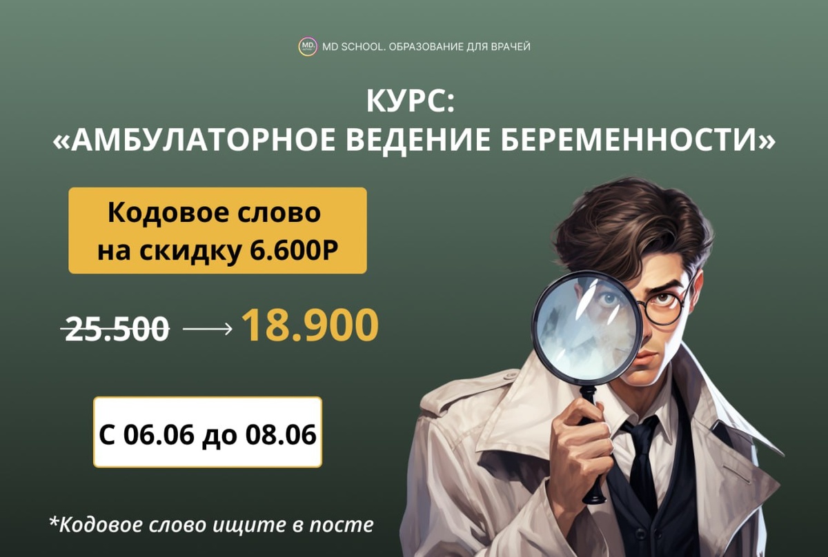 Только 3 дня! Секретное слово на 6.600 рублей 🤫 Именно такую скидку могут получить все, кто давно хотел пройти обучение на курсе "Амбулаторное ведение беременности", но постоянно откладывал! Как это сделать: 1. Подать заявку на сайте 2. Дождаться сообщения от нашего менеджера (он напишет вам в Вотсап) 3. Сказать ему кодовое слово - "Первый поток" Что дает кодовое слово: - скидку 6.600 рублей на тариф с обратной связью (теперь можно обучиться на курсе всего за 18.900Р вместо 25.500Р) - курс "Эффективное общение с пациентом" за 0руб (вместо 9.900Р) - итого общая выгода - 16.500Р 🔥 Что включает курс: • Современные методики диагностики и ведения беременности. • Пошаговый разбор сложных клинических случаев. • Практические навыки по ведению беременностей высокой группы риска. • Удобная структура курса, которая станет вашим настольным справочником. • 72 балла НМО и диплом государственного образца. Не упустите шанс пройти курс по специальной цене! Предложение ограничено и действует до 8