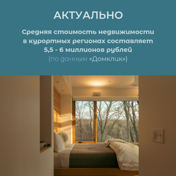В числе прочего, эксперты выяснили, что средняя стоимость недвижимости в курортных регионах составляет от 5,5 до 6 миллионов рублей. За эти деньги можно купить квартиру площадью около 50–55 квадратных метров.