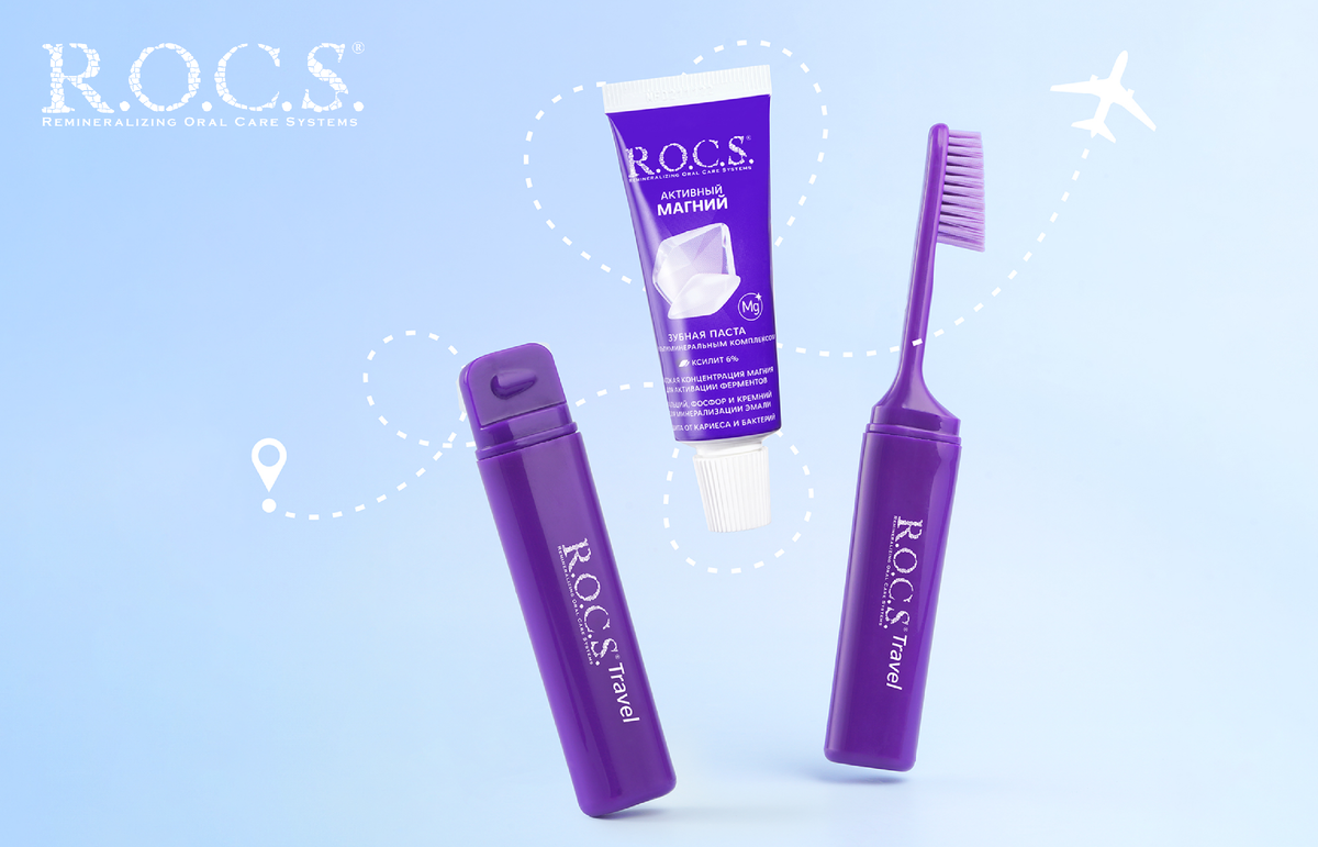 Путешествия — это свобода, новые места, вдохновение. Но даже в самых насыщенных днях важно помнить о главном: здоровье зубов не уходит в отпуск. Рассказываем, как не жертвовать качественным уходом за полостью рта, когда вы в дороге — и какие средства R.O.C.S. помогут вам в этом. Удобный формат пасты — максимум пользы Когда каждый грамм в багаже на счету, важно брать с собой только то, что действительно нужно. Удобное решение — зубные пасты R.O.C.S.® в формате 94 г: их можно спокойно взять в ручную кладь. А значит, ваша защита от кариеса будет под рукой, где бы вы ни были. Не только паста Пасты — это база, но хороший уход в дороге невозможен без дополнительных средств. Совет: добавьте в дорожную косметичку ополаскиватель R.O.C.S.® «Максимальная свежесть». Он помогает сохранить дыхание свежим и активно работает против кариесогенных бактерий. Щетка тоже имеет значение Пластиковая щетка, валяющаяся в рюкзаке без чехла, — не лучший вариант. Лайфхак: возьмите с собой щетку R.O.C.S.® Travel