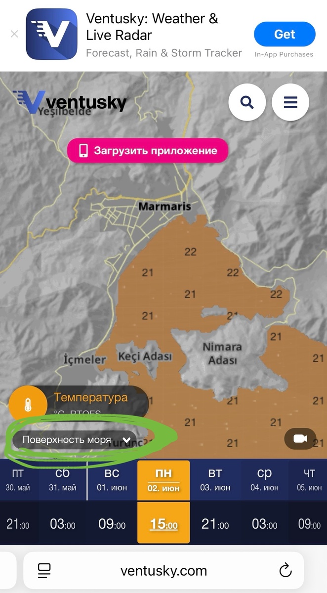 На среду передавали поистине летнюю жару, море тоже по прогнозу должно было потеплеть до 21 градуса. Мы проверяем прогноз погоды и температуру воды на сайте ventusky.