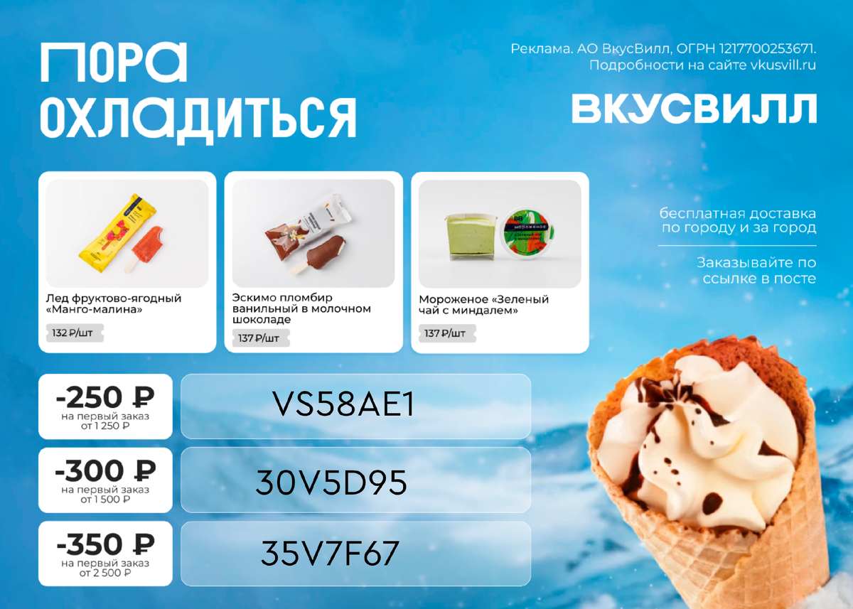 Топ-6 летних вкусностей во ВкусВилл 😋 1. Сорбет «Манго-Маракуйя» 2. Десерт кокосовый замороженный «Гранат-Малина» 3. Натуральный концентрат из цитрусов для освежающего лимонада 4. Необычные лимонады. Например, малина-гибискус или со вкусом гуавы и цветков вишни 5. Три вида окрошки: с куриной колбасой, говядиной и овощная 6. Желе фруктово-ягодное с кусочками манго, клубники и голубики 🔥 А еще вкусный квас, холодный гаспачо из запеченных овощей, лед из натурального фруктового пюре и т. д. Эти и другие вкусности можно заказать прямо домой – и не придется переживать, что что-то растает или испортится по дороге. Доставка бесплатная, даже за город! Ловите промокоды: VS58AE1 – 250 ₽ при покупке от 1250 ₽ 30V5D95 – 300 ₽ при покупке от 1500 ₽ 35V7F67 – 350 ₽ при покупке от 2500 ₽ За покупками сюда https://vksvl.prfl.me/6238cc608d70de4bf05c082d/aofog2?erid=2Vtzqx6Xqjj